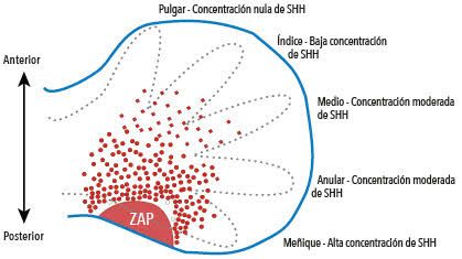 La proteína Sonic Hedgehog (SHH) es fundamental para el desarrollo de los dígitos. SHH se expresa en la zona de actividad polarizante (ZPA) del brote de la extremidad, estableciendo un gradiente morfogenético que determina el número y la identidad de los dedos. La expresión y regulación precisa de SHH son esenciales para la formación correcta de cinco dígitos. Mutaciones en la vía de SHH pueden resultar en anomalías como polidactilia (dedos adicionales) o oligodactilia (menos dedos). La regulación de SHH y su interacción con otros factores de transcripción es un área activa de investigación.